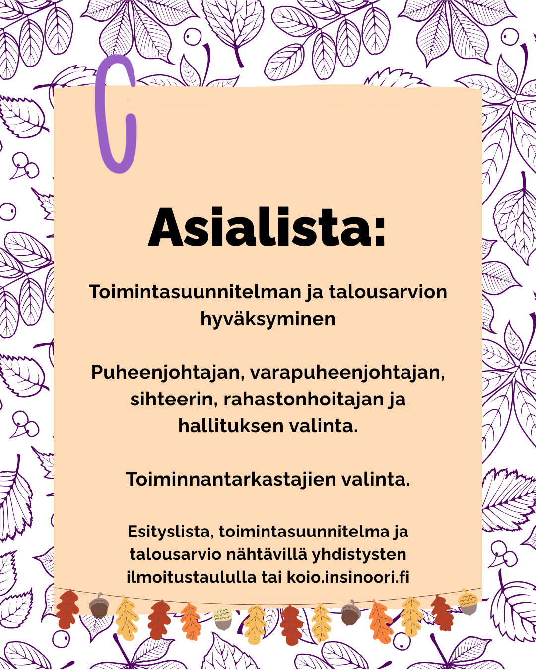 The agenda, action plan, and budget can be viewed on the association’s notice board and on our website at koio.insinoori.fi.